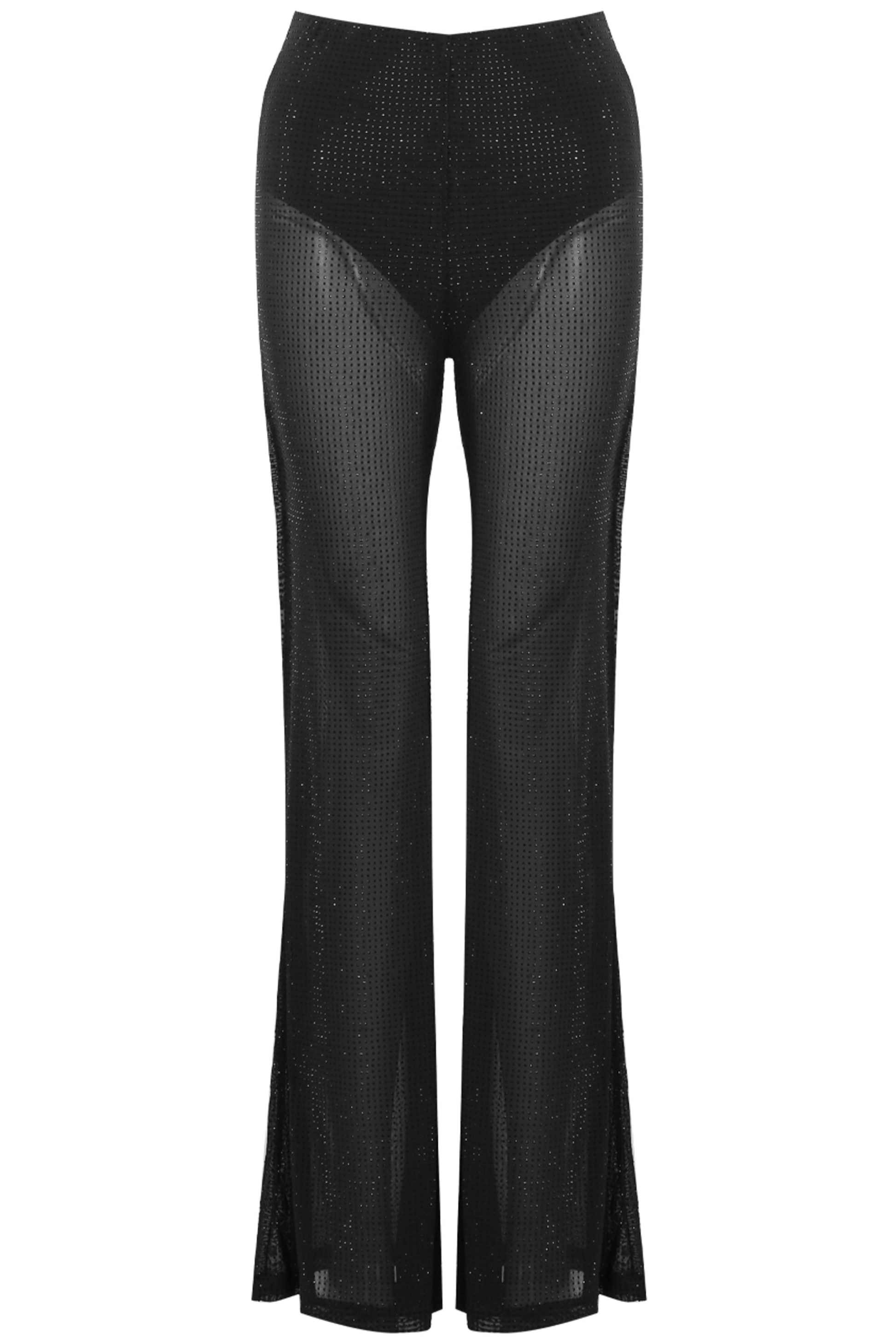 A strategic wardrobe statement designed to elevate after-dark styling. These black sheer flare trousers feature an all-over studded embellishment that subtly catches the light, delivering impact without overcomplication. The flared silhouette elongates the leg, while the sheer finish creates a confident, fashion-forward edge that transitions seamlessly from evening plans to occasion wear.